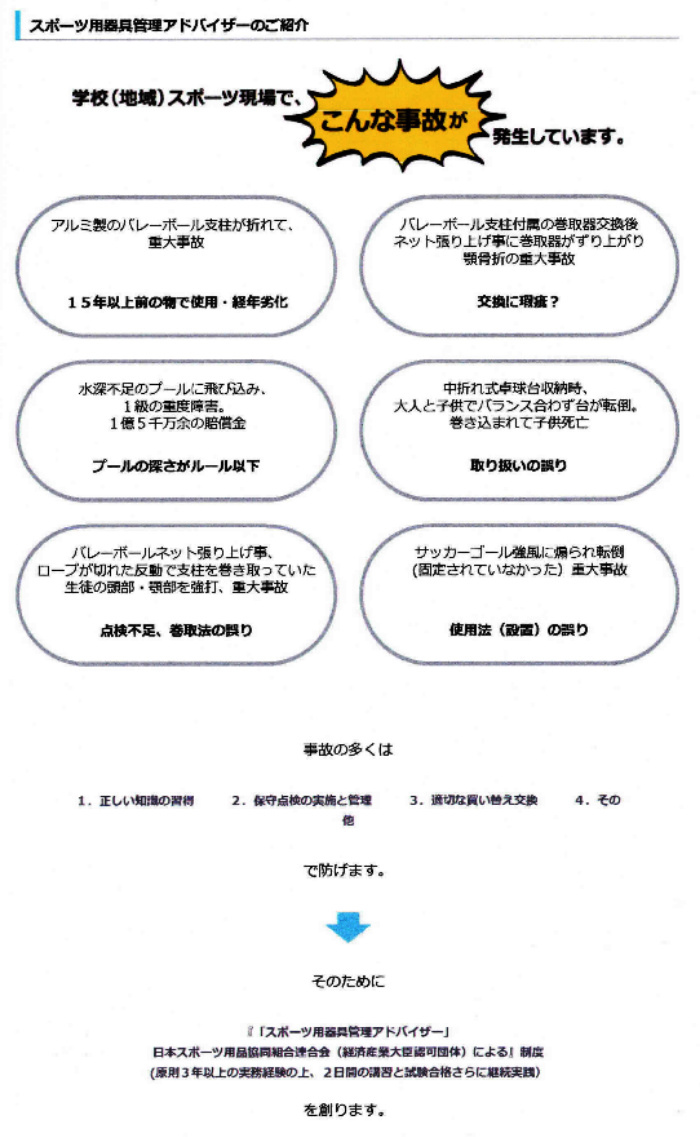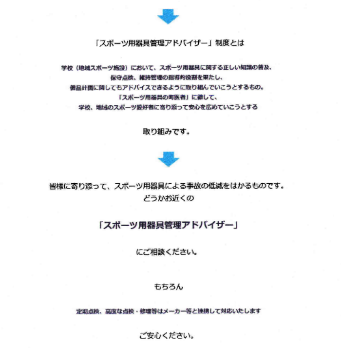 そのために、定期点検の手法・安全基準をしっかりと学び、”お客様に安心してスポーツを行える場の提供をさせて頂く” のも、運動具商協同組合の使命と捉えています。